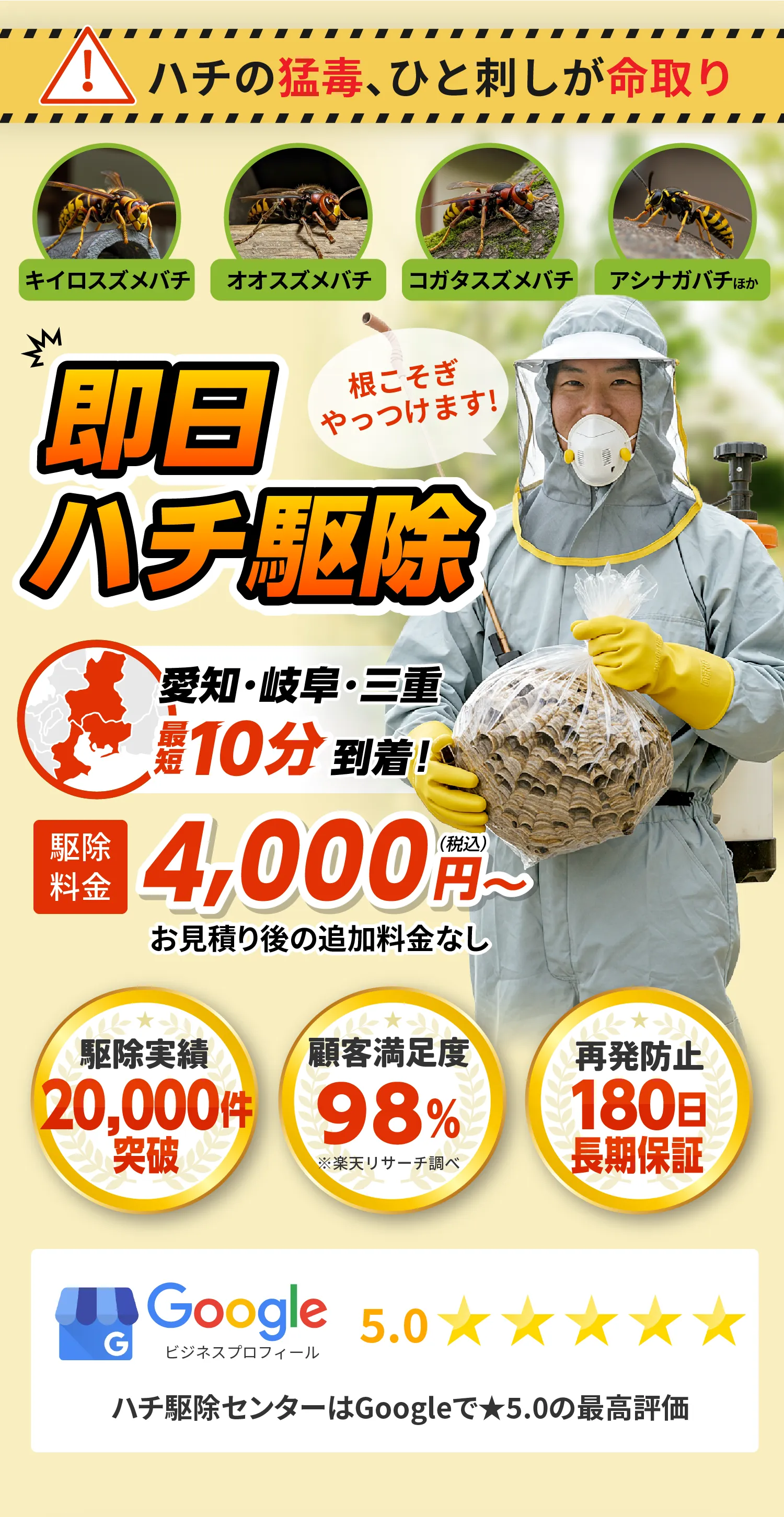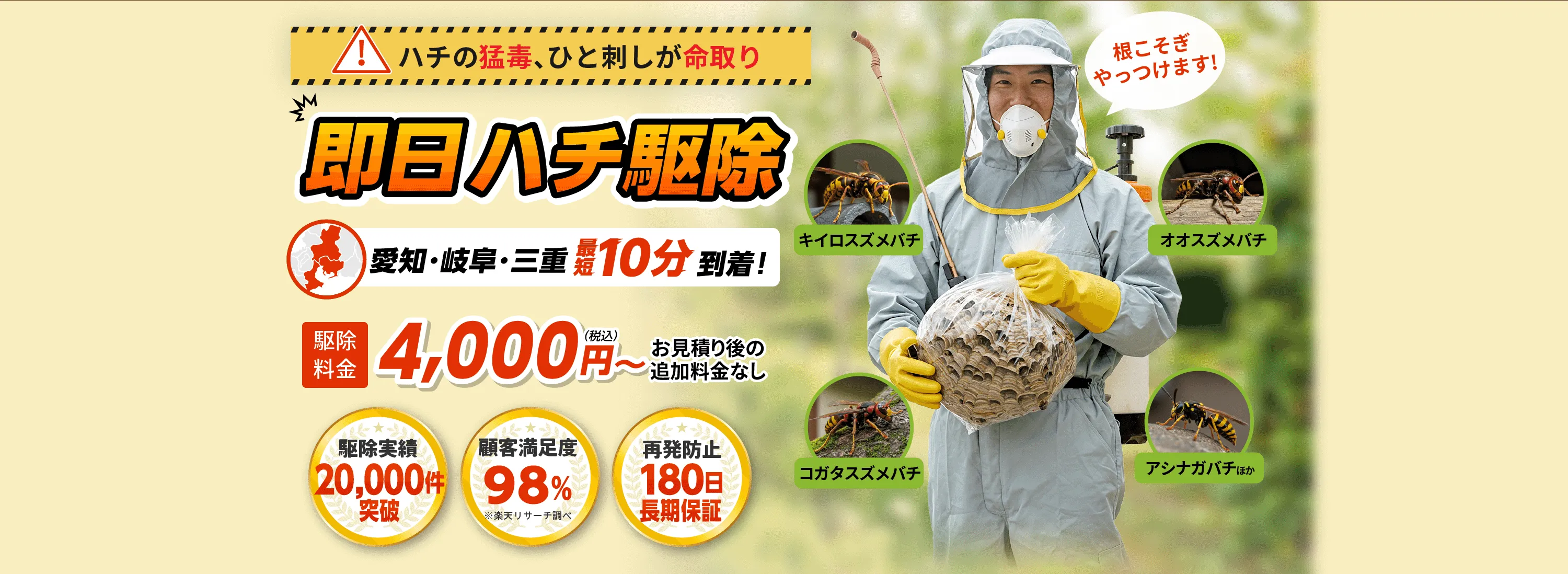 愛知・岐阜・三重の3県は最短10分で現地到着。スムーズな駆除で即日解決します。